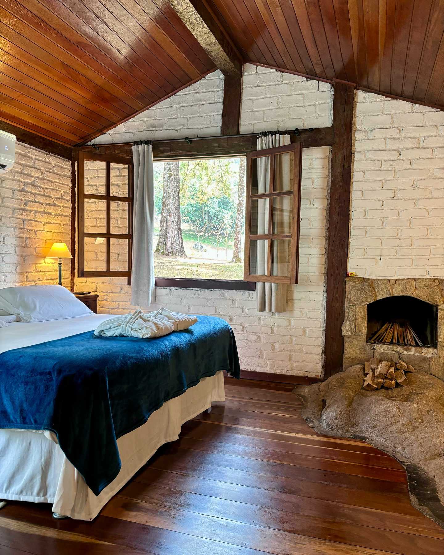 Pertinho da sede, os charmosos chalés sem hidro possuem sala com lareira e uma linda varanda com vista para o jardim.